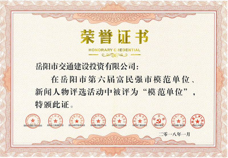 2018年1月榮獲岳陽(yáng)市第六屆富民強(qiáng)市模范單位