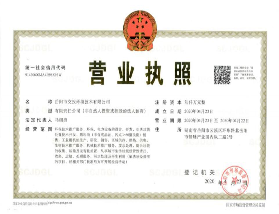 岳陽市交投環(huán)境技術(shù)有限公司成立于2020年4月,公司注冊(cè)資本為6000萬元,是岳陽市交通建設(shè)投資集團(tuán)有限公司全資子公司,主要從事環(huán)保技術(shù)推廣服務(wù);環(huán)保、電力設(shè)備的設(shè)計(jì)、開發(fā);生活垃圾處置技術(shù)開發(fā);燃料油銷售;工業(yè)用機(jī)油生產(chǎn)、研發(fā)、銷售;區(qū)域供冷、供熱、供電;生物技術(shù)推廣服務(wù);機(jī)械技術(shù)推廣服務(wù);廢水處理;廚余垃圾的收集、運(yùn)輸及無害化處置;從事城市生活垃圾經(jīng)營性清掃、收集、運(yùn)輸、處理服務(wù);污水處理及其再生利用。(依法須經(jīng)批準(zhǔn)的項(xiàng)目,經(jīng)相關(guān)部門批準(zhǔn)后方可開展經(jīng)營活動(dòng))。