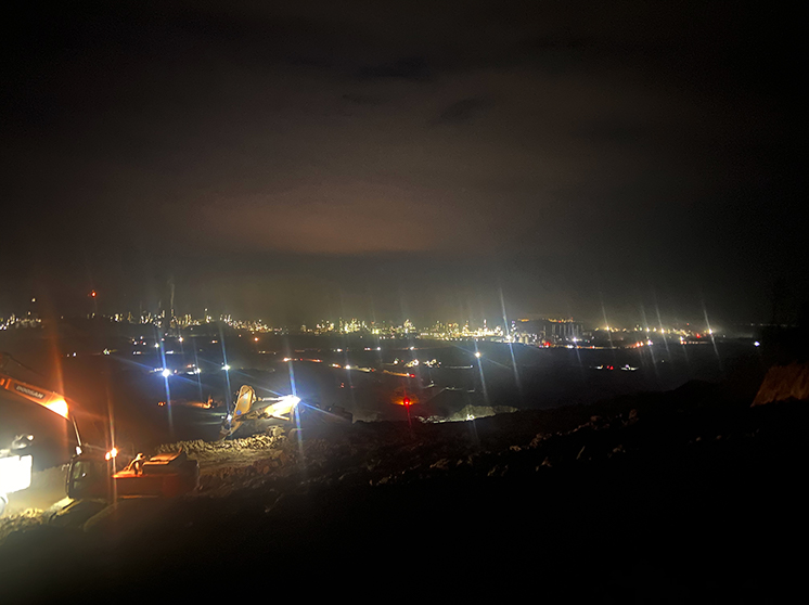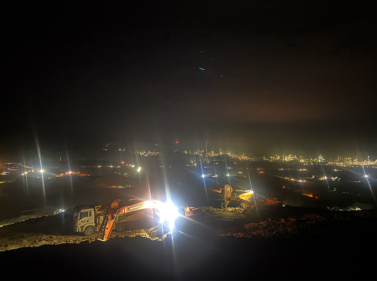 近日晚,在岳陽綠色化工高新區(qū)北側(cè)東側(cè)山體支護工程施工現(xiàn)場燈火如晝,30多臺大型挖掘機伸展著有力的臂膀,不停地挖掘和裝載著土石塊;90多臺渣土車來回穿梭,機械轟鳴聲喚醒寧靜的夜晚;北部區(qū)縣合作項管部和參建單位建設(shè)者們在夜幕里忙碌而有序地組織施工,以最昂揚向上的姿態(tài)與時間賽跑。